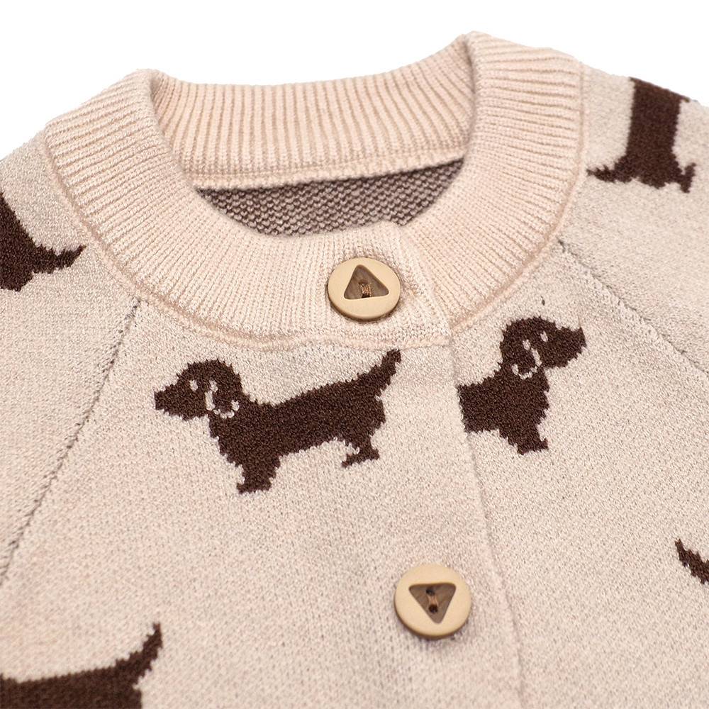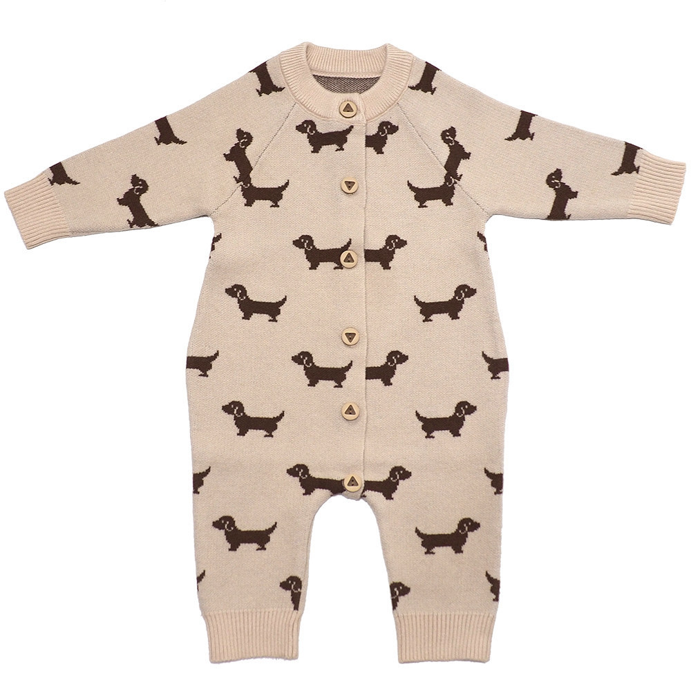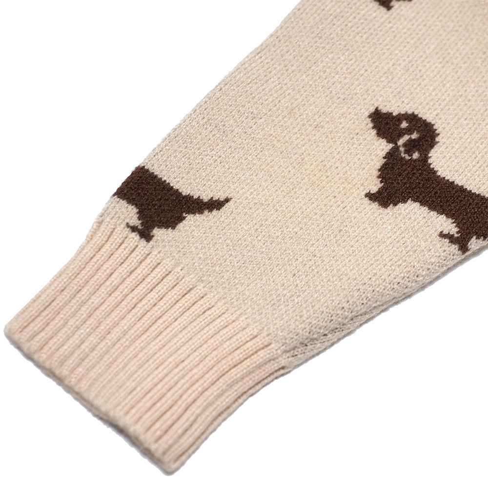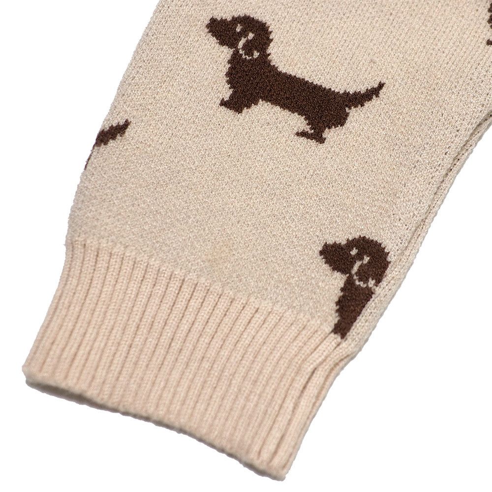 這款米杏色針織連身衣,佈滿了充滿童趣的深咖色臘腸狗圖案